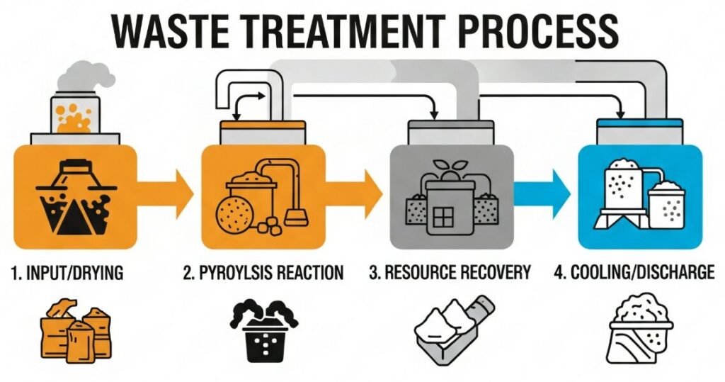 2. 熱分解反応 酸素が遮断された状態で、500~900℃の高温で加熱され、廃棄物は分子レベルで分解されます 。燃焼は一切起こりません 。